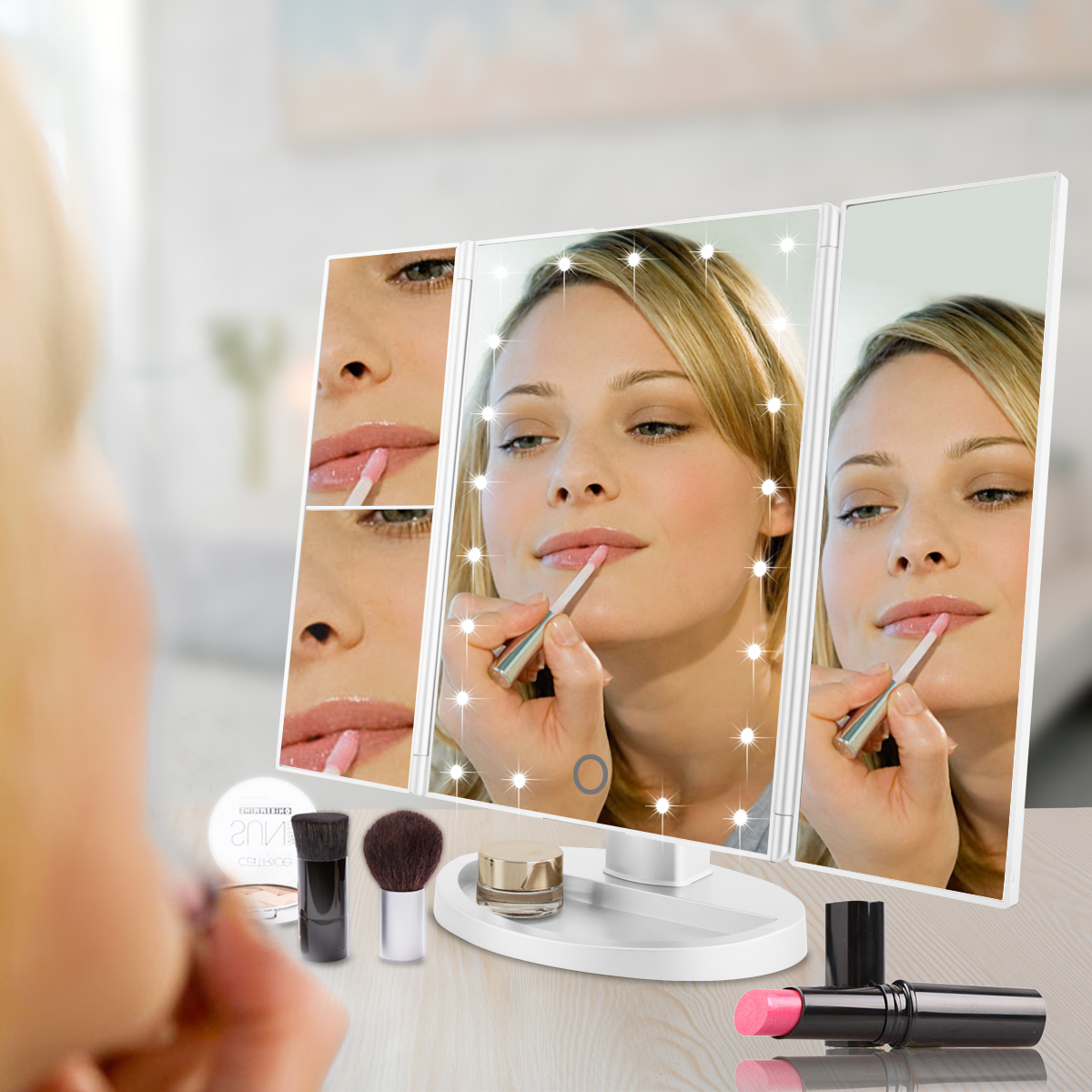 - MIRROR MAKEUP SUPER-BRIGHT: Gương trang điểm này được tích hợp đèn led 21 chiếc, chạm vào cảm biến của gương mỹ phẩm, tất cả đèn LED trên bảng gương vanity sẽ sáng. Độ sáng đủ để trang điểm ở nơi tối hoặc thiếu sáng. Bạn có thể điều chỉnh độ sáng theo yêu cầu của bạn.